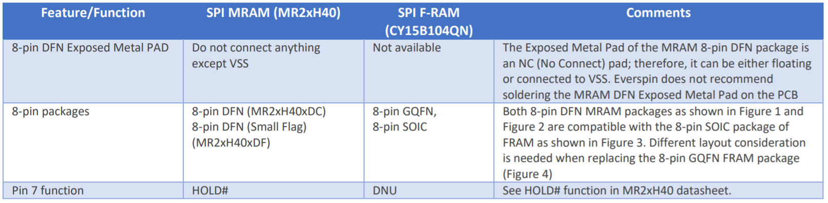 MR2xH40xDF是組織為512Kx8的4Mb非易失性RAM,采用標稱3.3V電源供電,并且與FRAM兼容。它提供標準的8引腳小標志DFN(DF版)和8引腳DFN(DC版),它們是多功能封裝選項,可以用SPI-FRAM8引腳SOIC和8引腳GQFN替代它。包(表1)。從硬件的角度來看,關鍵的區別在于用于封裝引腳(引腳7)的PCB的變化。從軟件的角度來看,這兩個設備之間的主要區別在于引腳7的功能和設備ID。當主機CPU必須中斷存儲器時,使用MR2xH40xDF的HOLD#引腳(引腳7)另一個任務的操作。當HOLD#為LOW時,當前操作被掛起。設備將忽略SCK或CS#上的任何過渡。當SCK為低電平時,必須在HOLD#上進行所有轉換。如果不使用,此引腳必須連接到VDD。可能需要更改硬件和軟件才能在MRAM上啟用HOLD#功能。