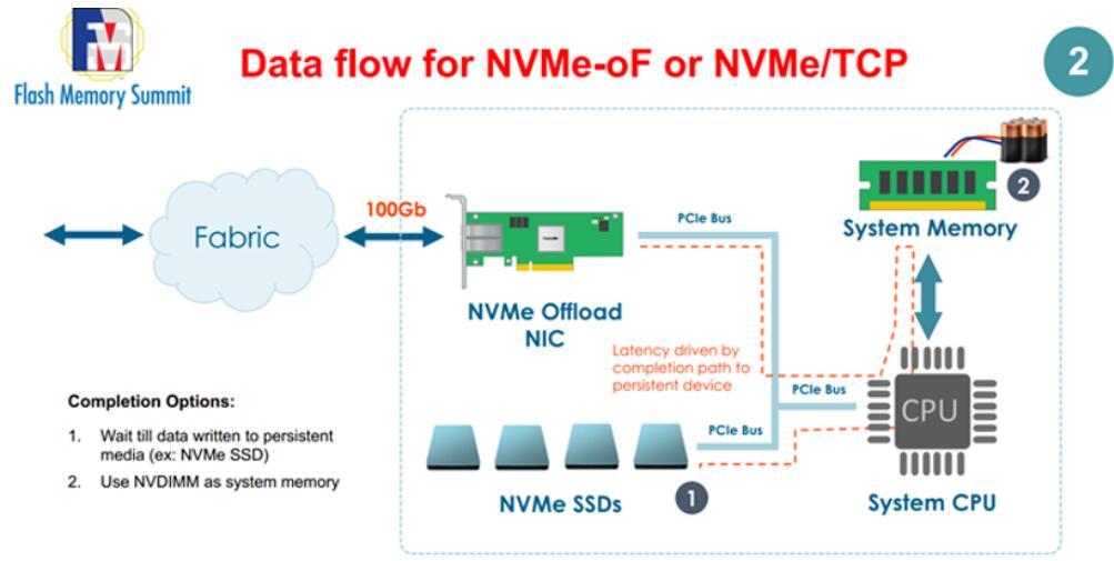 以下圖片是傳統的NVMe-oF的數據流,要通過系統內存和CPU再進入NVMe SSD,這樣會導致讀寫延遲比較長。